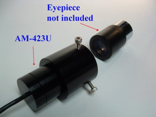 This eyepiece digital camera (USB 2.0) AM423U is professionally designed for traditional microscopes, with 36mm inside diameter fits most Microscope Eyepiece. It works perfectly with all kinds of optical microscopes, such as Biological microscope, Metallurgical microscope and Stereo microscope, etc. The way the AM423U works is that it is made to be placed over an existing eyepiece that has a 36mm outer diameter or smaller. The AM423U is made to see through your current existing eyepiece which eliminates the need to figure out your microscopes eyepiece slot aperture.The images of the observed specimen or samples can be accurately displayed on the computer screen. The powerful, advanced software included with the camera ensures simple and convenient operation allowing easy capture of images from the microscope! Included with each Dino-Lite digital microscope is a copy of the "DinoCapture" software, enabling you to "capture" either a photograph, video or time-lapsed video with a simple click!Microscope Dimensions and Weight: Body length: 3 inches / 7 cm Body Diameter: 70mm (L) x 45mm (D) Cable length: 6 feet / 180 cm Mechanical Layout: Body with USB cable: 6.3 Oz / 192g +/- 10g Total unit with cable weight: 0.8 lbs / 380g +/- 20g (not including manual) Camera Size: 70mm x 45mm (D) with 36mm inside diameter Regulatory Approvals: CE, FCC, ROHS Package includes:Dino-Eye Digital Microscope Eyepiece Camera "Dino Capture" Software CD with Instruction manual Product Requirements: Intel Pentium 4 2.4G MHz processor or faster Windows 2000/XP, Vista 512 MB RAM CD-ROM drive 16-bit color display monitor or higher Available USB 2.0 port